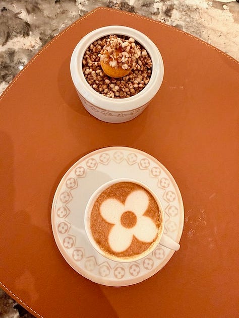 Louis Vuitton x Gaggan: Gaggan has recently partnered with Louis Vuitton to open a plush eatery in the Bangkok flagship store with witty chef Vix Rathour on the pass in charge of the savoury dishes. We visited after a street food lunch (see further below), so only managed to squeeze in desserts by pastry chef Dej Kewkacha paired with a grower Champagne. Remarkably not from an LVMH Champagne house.