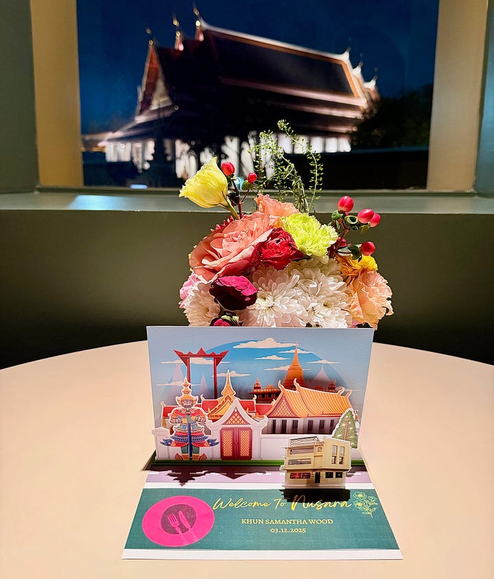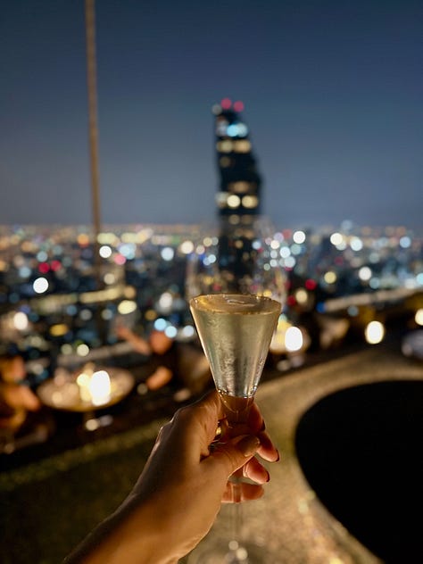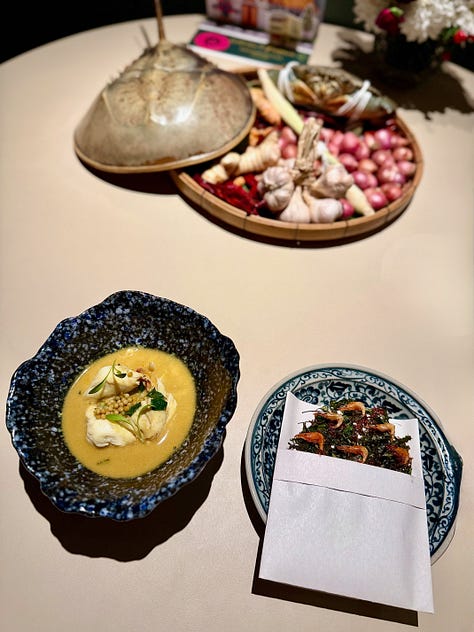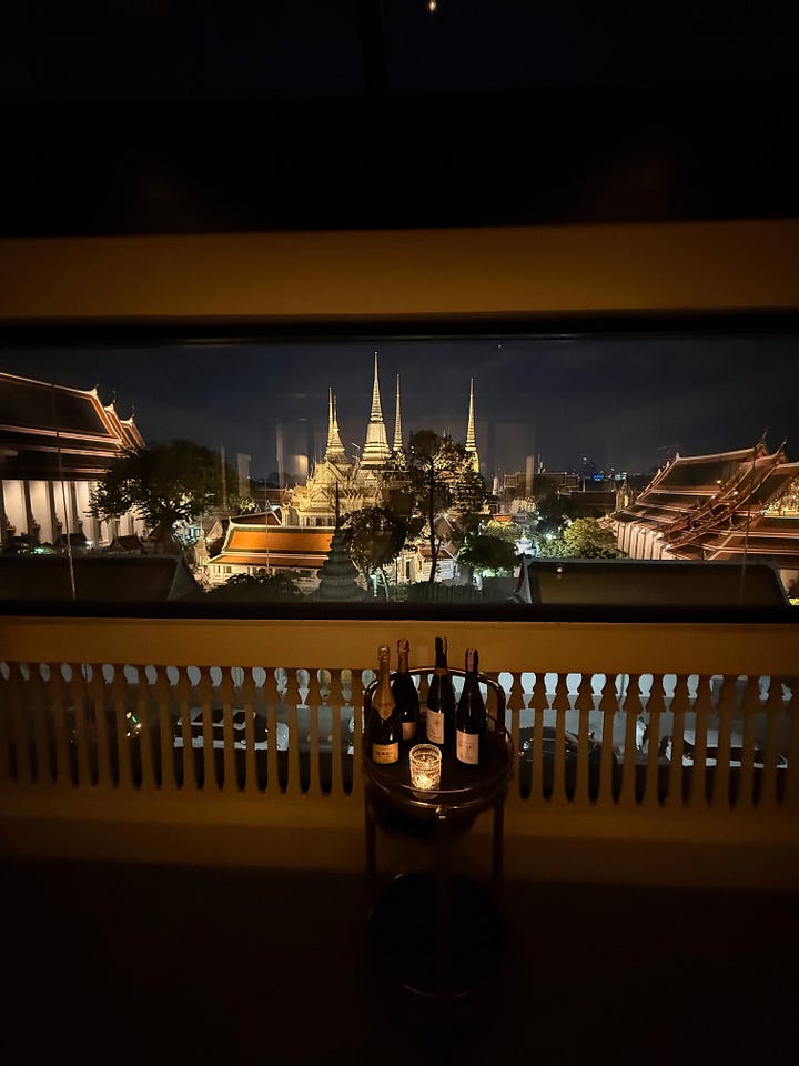 Nusara: Thai chef Tonn opened this restaurant with his brother and sommelier Tam soon after my 2023 visit, so it’s my first time dining here. Breathtaking views straight across to the Grand Palace and Reclining Buddha from both the patio and indoor tables. My kind of sightseeing. An 11-course tasting menu pays tribute to their grandmother’s cooking with a modern, elevated spin on Thai classics. Fave dish? Crisped shrimp and garuda leaves that you crunch into a blue swimmer crab curry. Fave drink? Easy…the Krug as an aperitif. THB6,990++ (AED805) food only with wine pairing additional.